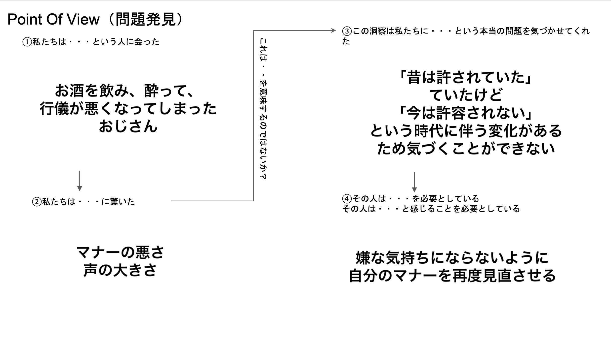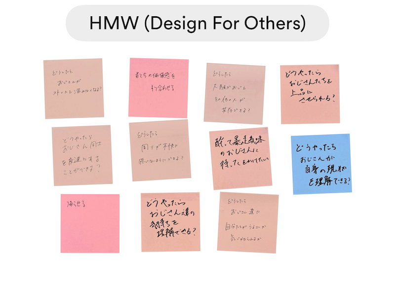 今回は共感マップ、HMW分析、Point Of View(POV分析)などの分析、思考方法を用いて「誰かのためになるもの」を作成しました。