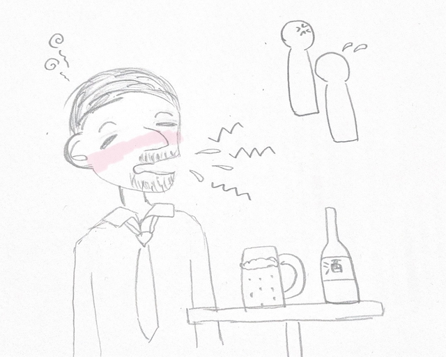 お酒を飲んで、声が大きくなったり、食べこぼしが多くなってしまった中年の方を見つけました。